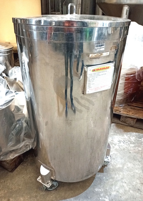 Marca: Varimaq Série: 0708TV150L0001 Código: 0708-TV-200L Capacidade: 200 Litros Pressão: ATM Base com rodízio Acabamento sanitário Medidas Diâmetro: 550 mm Altura: 900 mm
